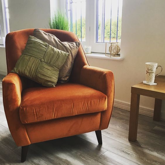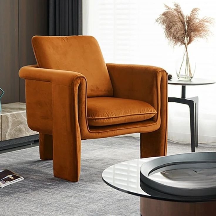 Urban interiors get a plush upgrade with this smooth velvet brick-colored chair. The straight, robust arms provide a structured look, juxtaposed beautifully against the softness of the cushion. Perfect for a contemporary living room, this chair promises to be a stylish and comfortable retreat.