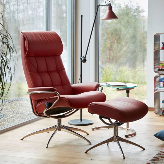 For those who appreciate the fusion of comfort and style, this contemporary recliner and ottoman set in a brick hue is a dream. With its streamlined design and smooth leather finish, it’s the perfect spot to relax by the window, book in hand, and a cup of tea within reach.