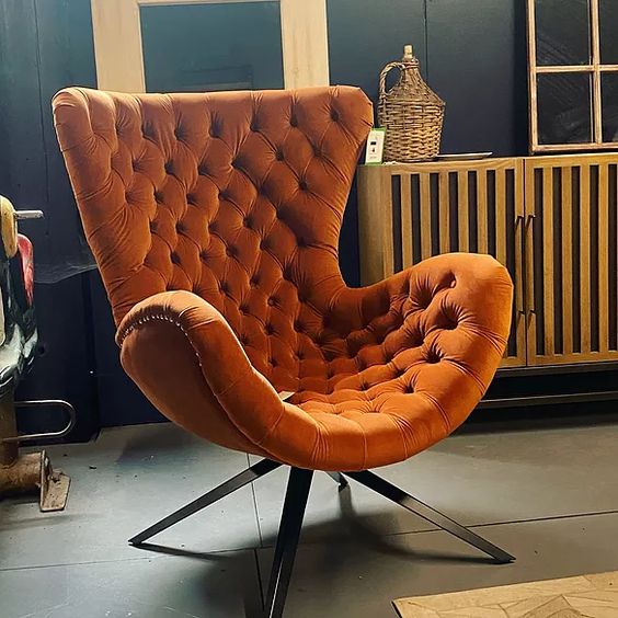 The deep tufting of this brick-colored chair presents a regal aesthetic. Its wingback design and rich texture make it an ideal throne for any modern monarch of style. Set it in a room with minimalistic decor and let it be the standout piece that speaks volumes.