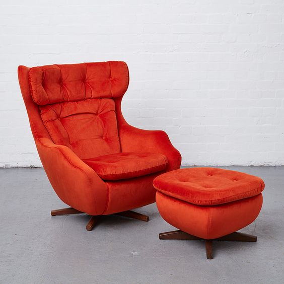Finally, this iconic chair with its undulating contours and vibrant brick red upholstery is a testament to the timeless appeal of mid-century design. Paired with a matching footstool, it invites long hours of lounging and adds a burst of color and retro flair to any room.
