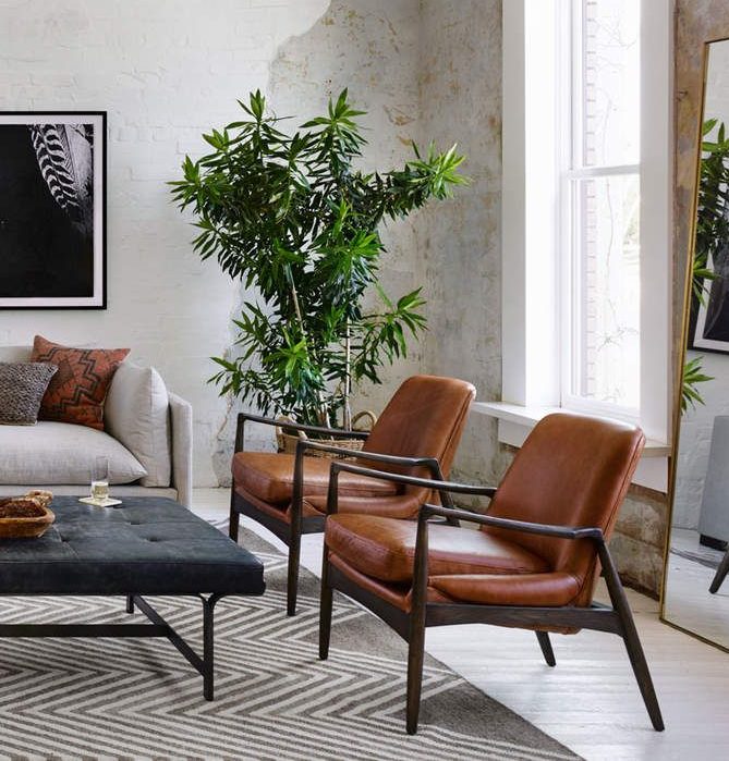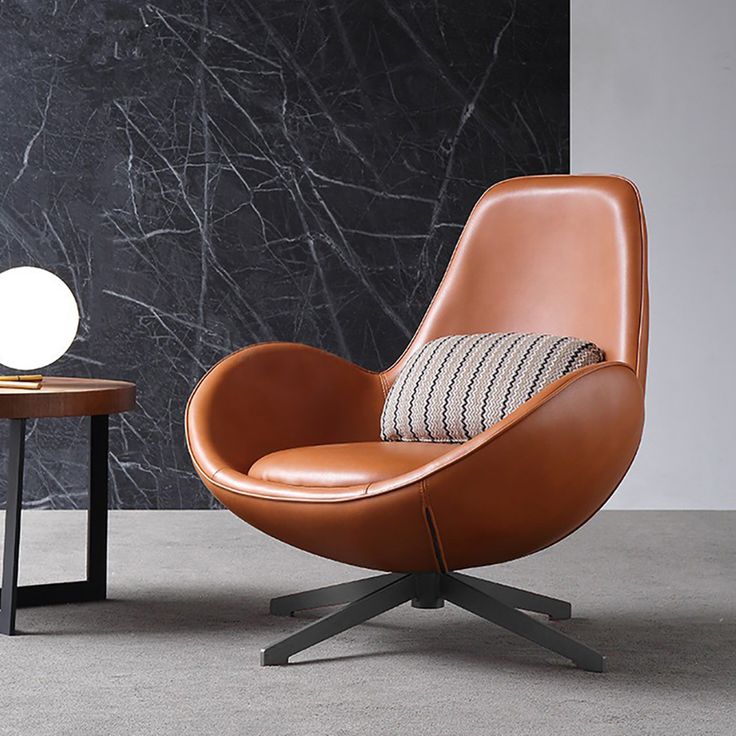 Elevate your lounge area with the understated opulence of these leather chairs. Their sleek lines and warm color are reminiscent of a refined library or a sophisticated office setting. They pair beautifully with wood and neutral tones, enhancing the space with a touch of luxury.