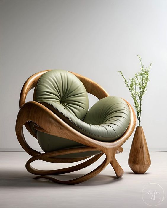 This chair is not just a seat but a sculpture that invites you to sink into its cushions. The organic flow of the wood mimics the natural curves of the body, creating a sense of harmony and relaxation. The seamless structure of the chair’s base forms a continuous loop, suggesting an infinite cycle of comfort and style. The plush green cushions offer a visual and tactile contrast to the warm wooden tones, making it a perfect wooden chair design modern statement for any living room or office.