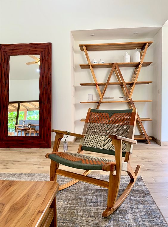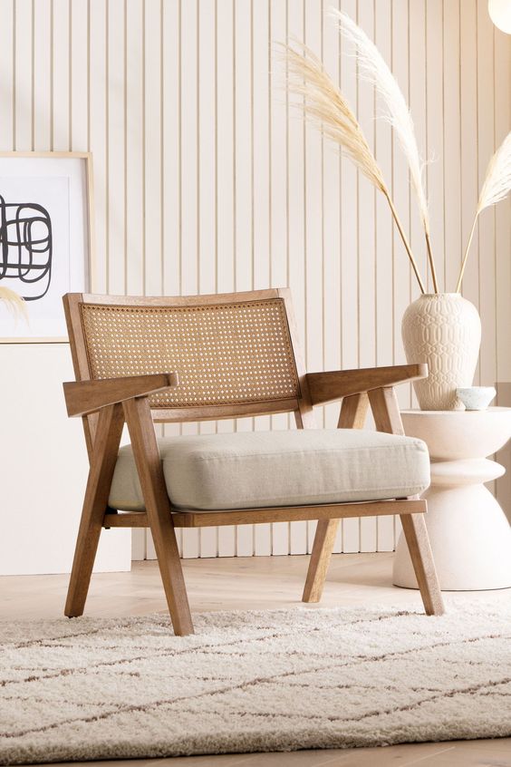 With its mid-century modern vibe, this chair combines the timeless beauty of wood with the intricate detail of woven backrests. The clean lines and angled legs are complemented by a neutral cushion, making it a versatile piece for a minimalist or boho-styled living room. The chair’s design is not only about style but also functionality, offering comfort without compromising on elegance.