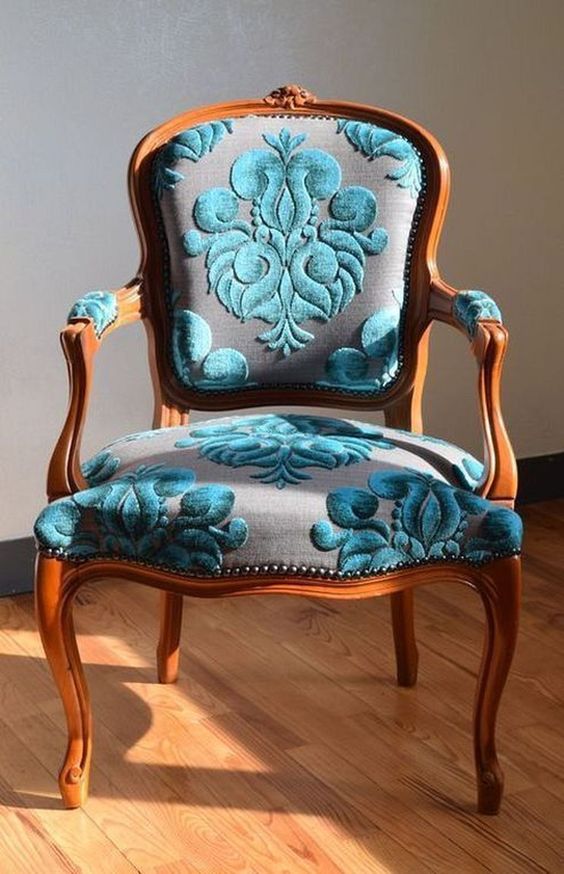 A classic design that never goes out of style, this chair features elegant wood carvings and plush upholstery. The turquoise floral pattern against the grey backdrop adds a contemporary twist to a traditional design. It’s an ideal wooden chair design for dining table that can also serve as a sophisticated touch in a vintage-themed living room.