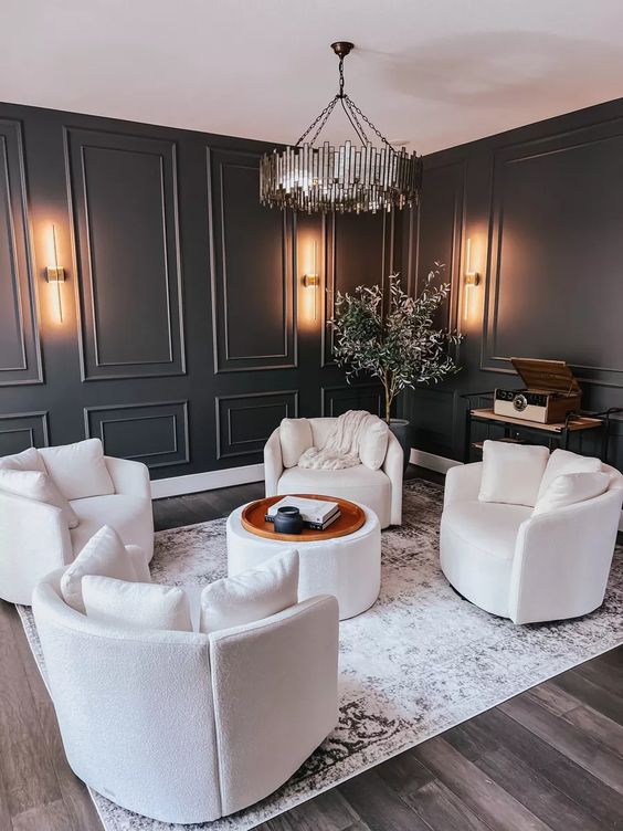 Gather around in luxury with a quartet of ivory chairs, poised around a central coffee table. This layout promotes intimacy and conversation, the chairs’ soft upholstery echoing the comfy and modern ethos of 2024’s living spaces. The living room chairs only approach, without a sofa, creates a more open and inviting space, perfect for modern entertaining.