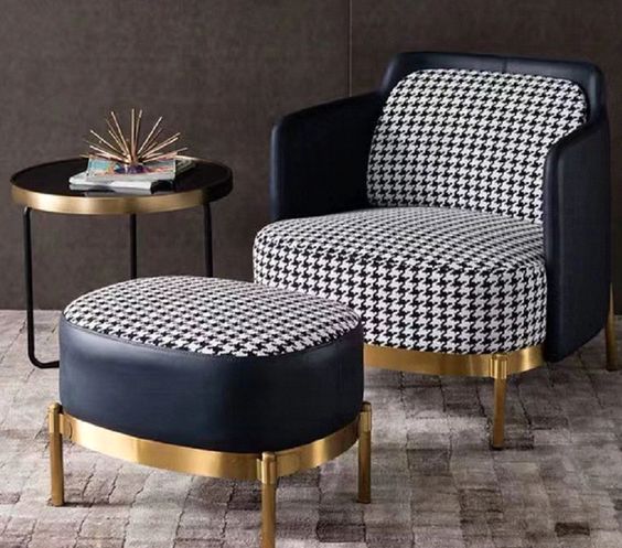 The timeless pattern of houndstooth is given a new lease of life in this chair and ottoman set. The pairing of classic print with contemporary lines and gold accents brings a vintage yet modern feel to the forefront. It’s a living room chairs with ottomans combination that adds sophistication to any space.