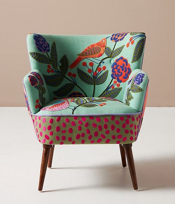 Inject a burst of color and whimsy into your living room with a chair that features a vibrant bird print. This piece captures the essence of boho chic with its playful pattern and solid, vintage-inspired legs. It’s a bright and cheerful addition that offers both a visual feast and a comfy nook.