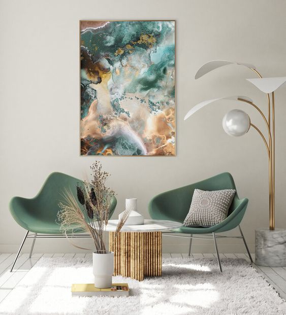 The symmetry of these green chairs offers a visually pleasing, balanced look to the modern living room. The clean lines and muted color palette are a nod to minimalist design, while the setting encourages social interaction, perfect for living room chairs and couch setups.
