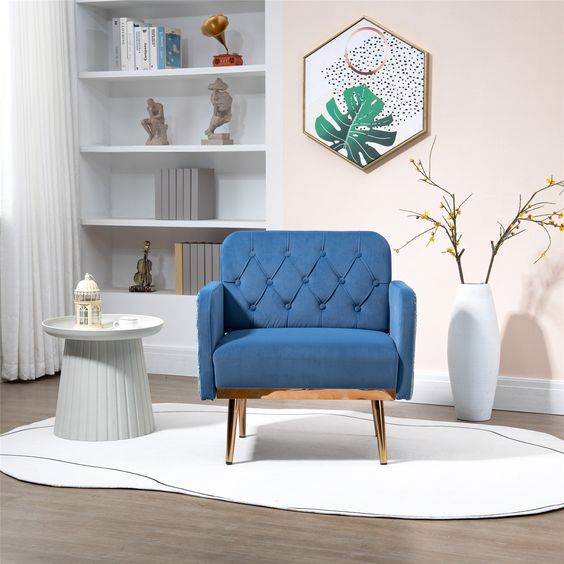 2024 is the year to make a statement with your furniture, and what better way than with a striking blue armchair? This piece combines vintage charm with contemporary lines, offering a vibrant focal point in your living room. The diamond tufting and angular wooden legs make it a design masterpiece, perfect for spaces that celebrate bold ideas and hues.