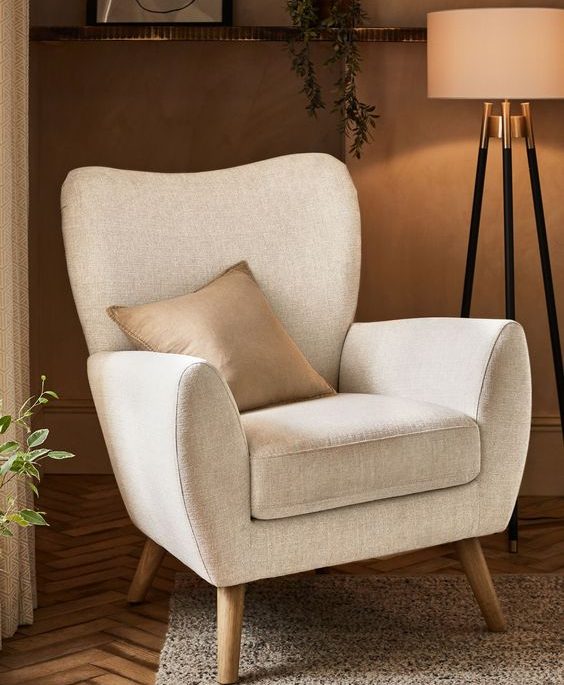 For a touch of understated elegance, the contemporary cream accent chair offers modern design with a soft, neutral palette. The angled wooden legs and the plush cushioning make it a comfy yet modern choice for any living room, and it’s versatile enough to pair with a variety of decor styles.