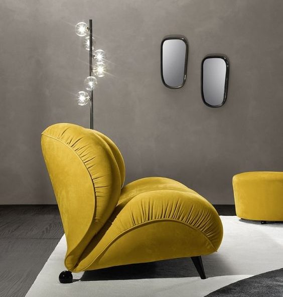 Velvet makes a bold statement in mustard, with this chair that invites you to recline in style. Paired with a soft sofa, it creates a rich, textural contrast in the living room. It’s the epitome of living room chairs comfy and modern, with a dash of vintage flair.