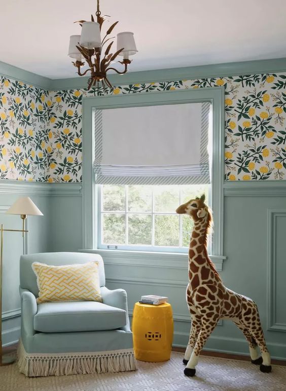Imagine a chair that brings a whimsical vibe to your nursery. Positioned against a backdrop of lemon-yellow wallpaper and a gentle sky-blue hue, this light armchair exudes a playful yet serene ambiance. Pair it with a quirky animal-shaped stool to spark your little one’s imagination and add a dash of joy to the room.