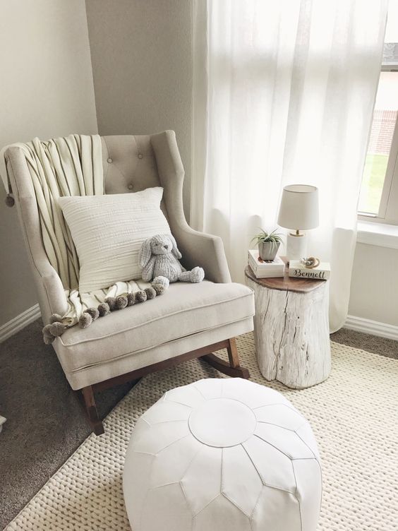 Why should nurseries adhere to adult norms? A chair that doubles as a delightful nursery chair and ottoman, upholstered in a playful color and adorned with pom-poms, invites both giggles and cuddles. It’s a nursery chair that doesn’t just sit in a corner; it beckons you to come, sit, and play.