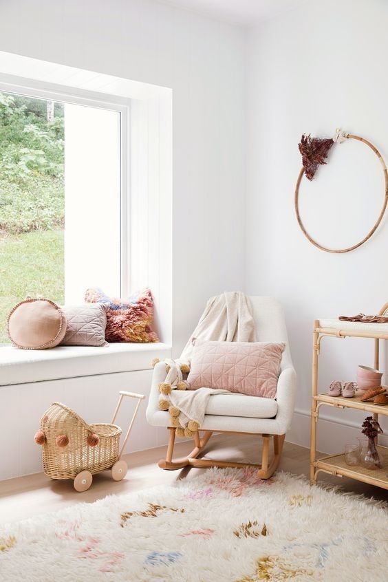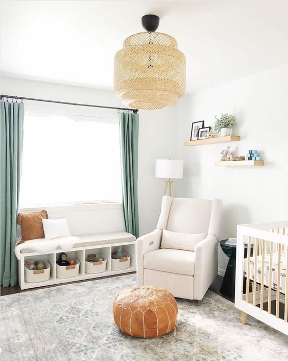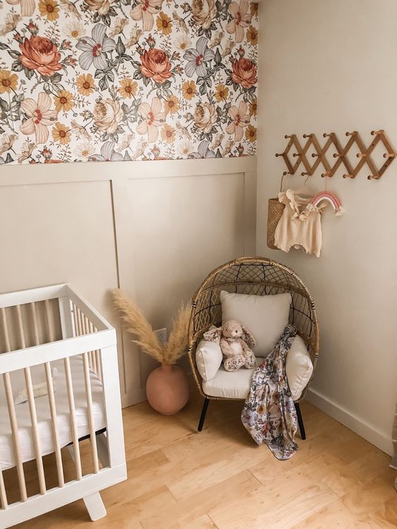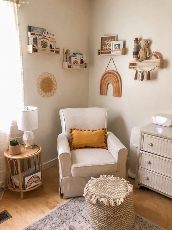 Boho isn’t just a trend; it’s a lifestyle that extends to the nursery with nursery chair ideas that incorporate natural materials. A rattan chair adorned with a plush nursery chair pillow, set against a backdrop of whimsical wallpaper, brings a touch of nature indoors. The nursery chair corner becomes a focal point, inviting storytelling and dream-weaving in the warm embrace of bohemian style.