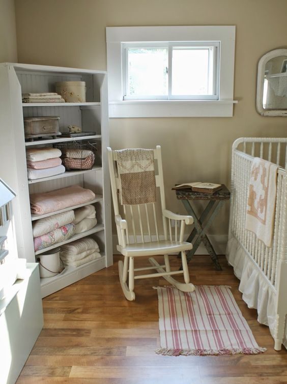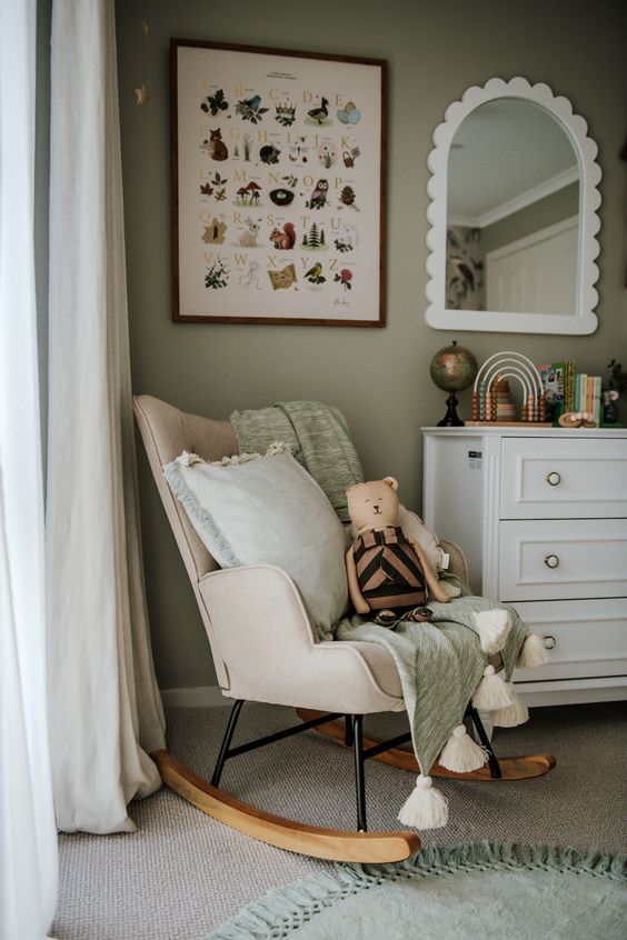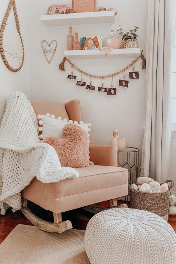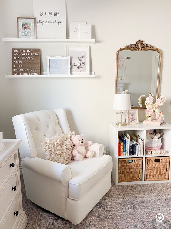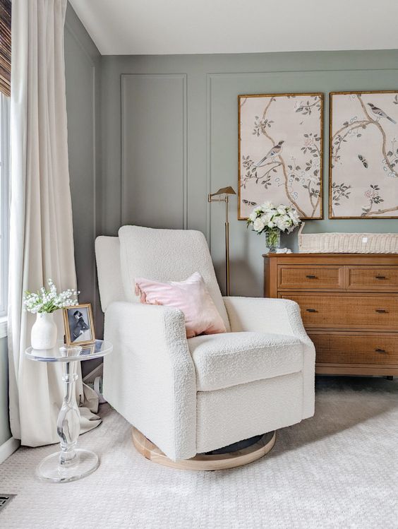 For those who adore vintage allure, a pastel pink chair with graceful lines becomes the nursery’s focal point. The soft color palette soothes the senses, and the classic design elements bring a timeless charm that whispers stories from a bygone era.