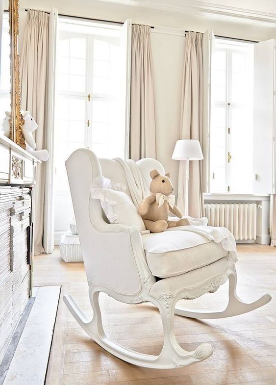 For those with a love for the vintage aesthetic, a grand rocking chair with ornate details could be the nursery chair of choice. Its majestic curves and plush cushions speak of an era gone by, making it a statement piece that’s as photogenic as it is functional.