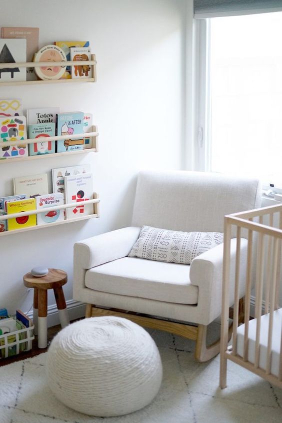 Scandinavian design principles shine through in a bright white chair that balances beauty with functionality. The clean aesthetic, combined with cozy textiles, offers a tranquil space for storytelling and lullabies.