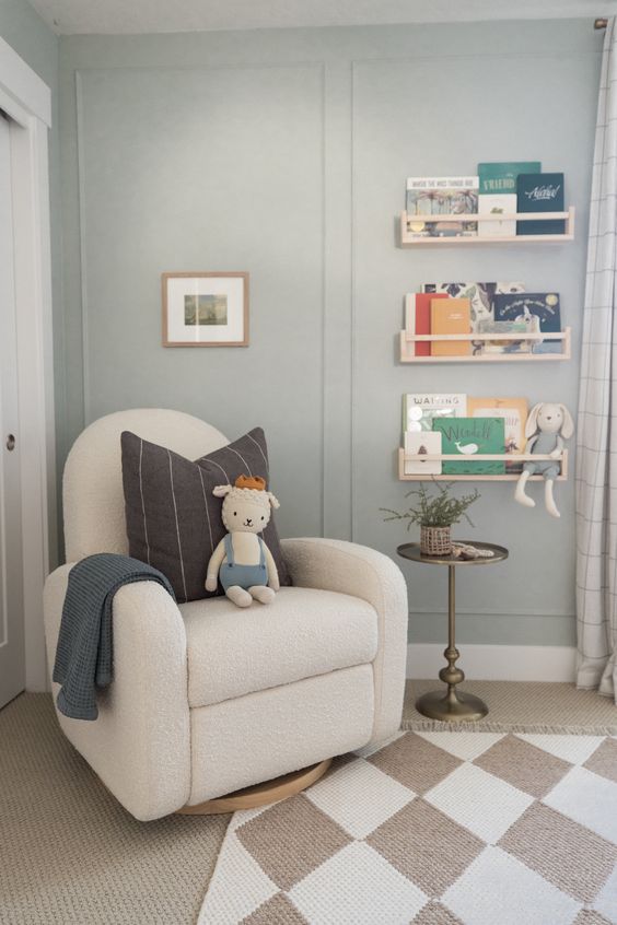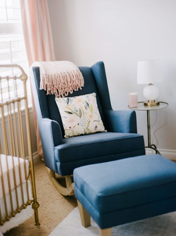 Bold yet calming, a deep blue nursery chair paired with a side table and soft throw makes a statement. It’s a nod to classic style with a color that promotes both tranquility and deep thought, perfect for those quiet moments before bedtime.