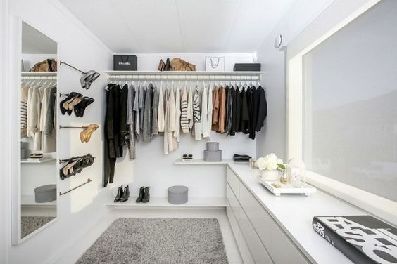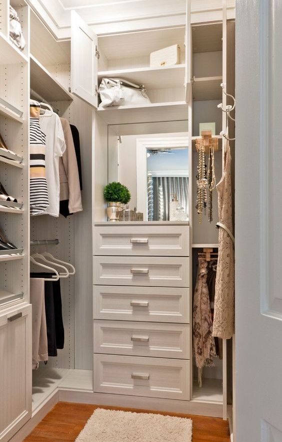 Closet organization ideas small walk in closets can be a challenge. My tip? Add a mirror or vanity to create an illusion of space and use slim-profile hangers to save on hanging space.