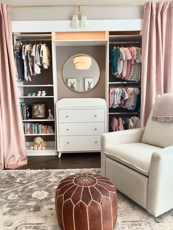 In a nursery, closet organization should be simple and safe. Use soft bins and lower shelves for easy access to baby essentials.