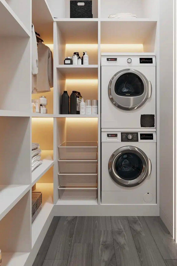 In a laundry room, integrate a closet for linen and cleaning supplies. This keeps everything organized and out of sight.