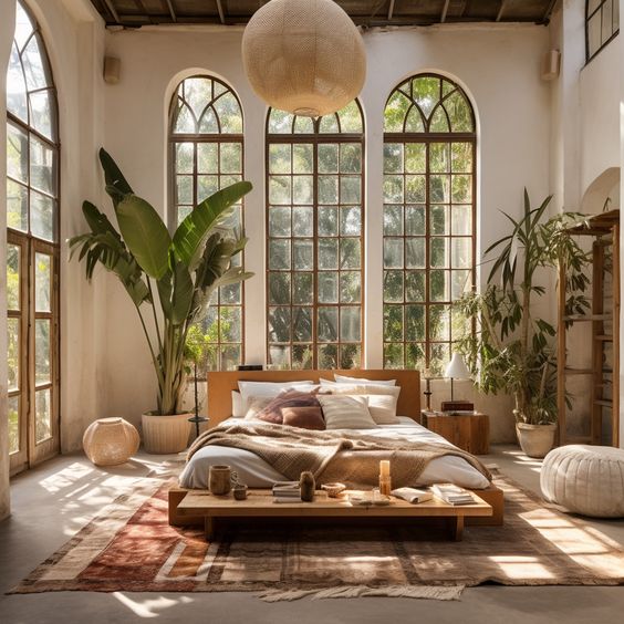 The thirteenth concept takes us to a bedroom where aesthetic pleasure meets minimalism. Here, towering windows allow natural light to bathe the room, accentuating the modern minimalist design. Indoor plants bring a touch of spring to this serene sanctuary.