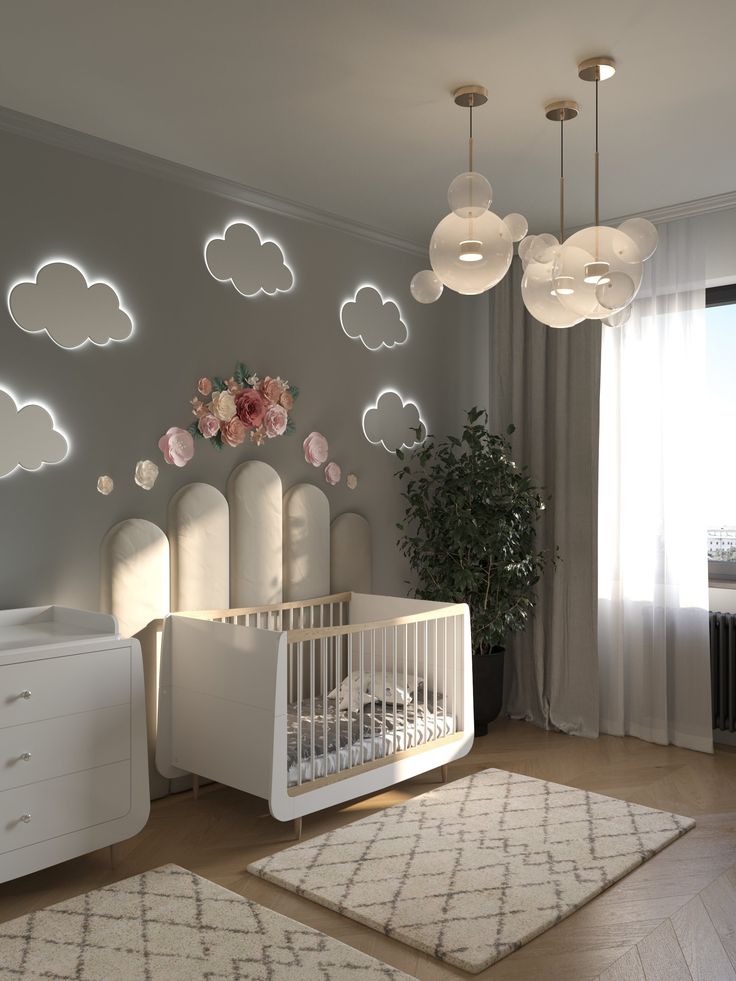 Our next vision is a nursery that looks straight out of a fairy tale. Whimsical clouds and floral arrangements adorn the walls, creating a dreamy atmosphere that encourages imagination and dreams in the gentle embrace of minimalist design.