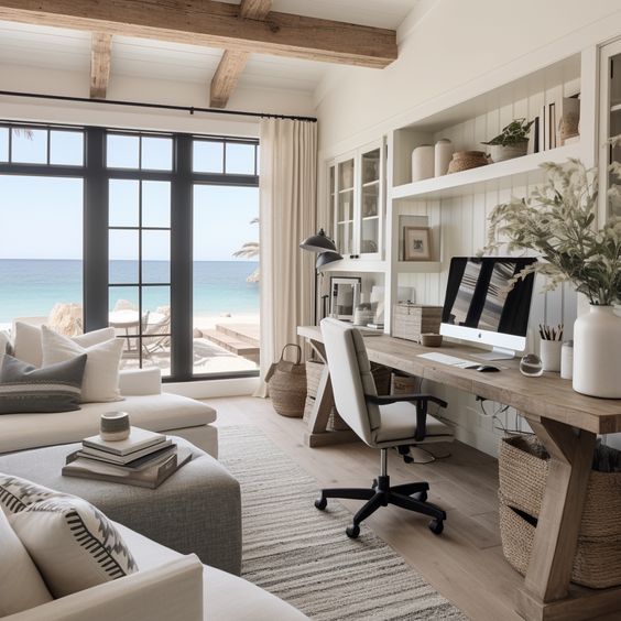 For those who work from the comfort of their abode, the fifteenth idea presents a home office that doesn’t just serve its purpose but also uplifts the spirit. The view of the ocean merges seamlessly with the room’s modern farmhouse interior, creating a tranquil space conducive to productivity and creativity.