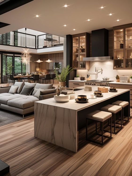Embracing the modernist mantra of open-plan living, our next house interior unfolds as a seamless space that blends cooking, dining, and relaxation areas. Here, the kitchen is not just a place for culinary pursuits but a central hub of home life, where conversations flow as easily as the wine from the cellar. The bold use of marble on the island adds a touch of luxury, while the overhead lighting brings a constellation indoors, playing up the modern minimalist theme.