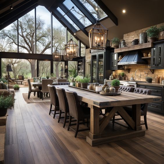 The juxtaposition of robust, weathered wood with the sleek lines of modern design brings us to a dining space that could easily double as a banquet hall in a contemporary farmhouse. This area merges house interior kitchen and dining room into a single cohesive space, perfect for large family gatherings or cozy dinner parties. The inclusion of lantern-style lighting adds an element of the vintage to the setting, while the expansive windows invite the outdoors to sit at the table with us.