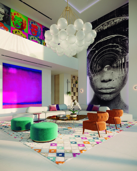 In a bold departure from the understated, we encounter a living room that is a riot of color and contemporary art. It’s an interior that defies the rules, marrying pop art with plush furnishings to create an environment that is as much a gallery as it is a house interior living room. This room is a testament to the aesthetic freedom that characterizes the year 2024’s approach to personal space.