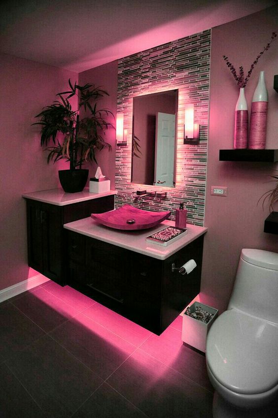 Finally, we step into a bathroom that takes ambiance to a new level with strategic lighting that transforms the space into a personal wellness retreat. The vibrant pink lighting contrasts with the darker tones of the fixtures, creating a house interior that is both intimate and modern. It’s a space that reflects the diversity of personal taste and the myriad ways in which a functional area can be transformed into a statement of style.