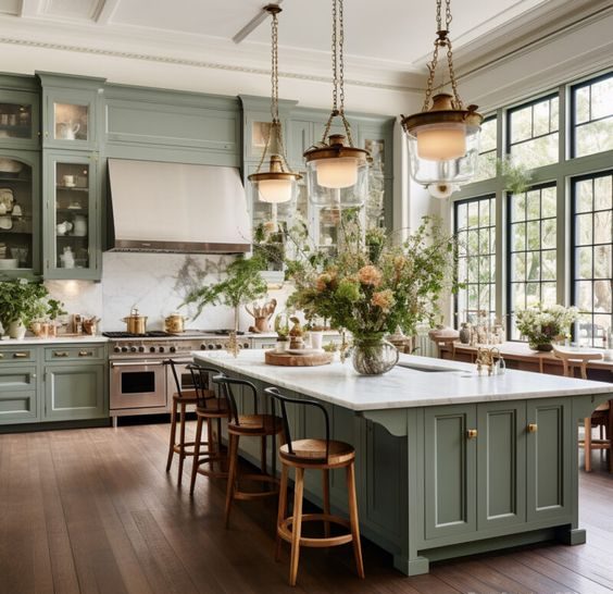 The ninth idea brings us to a house interior kitchen that feels like the heart of the home. It’s a blend of farmhouse charm and modern sensibilities, with soft green cabinetry that soothes the soul.