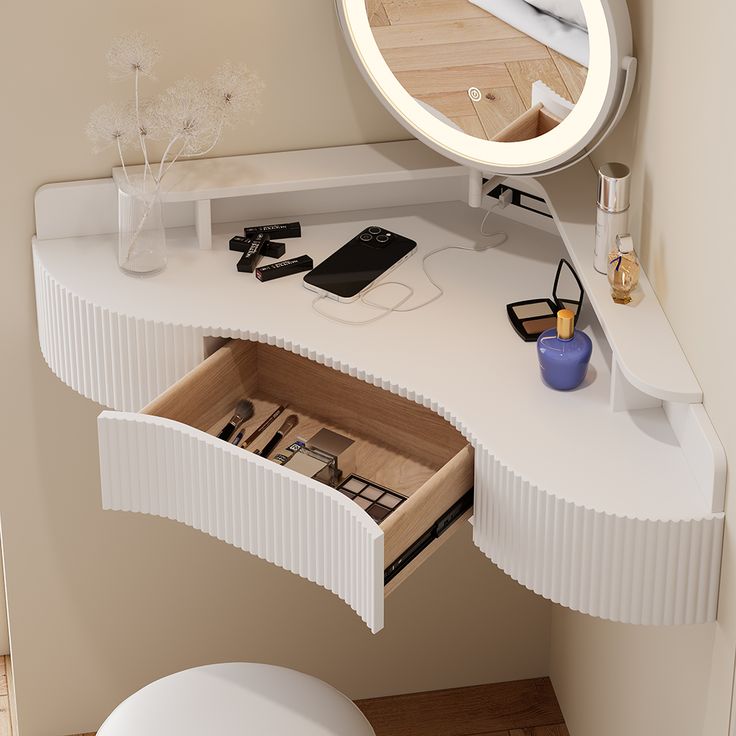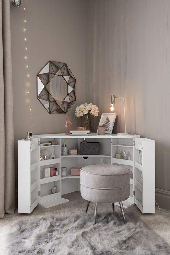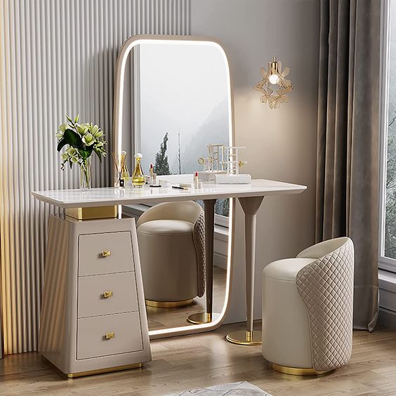 This dressing table idea is the epitome of modern sophistication. With a sleek design and integrated lighting, it brings a luxurious feel to the act of getting ready, while the clean lines ensure it fits into any contemporary bedroom seamlessly.