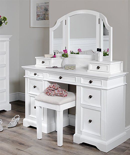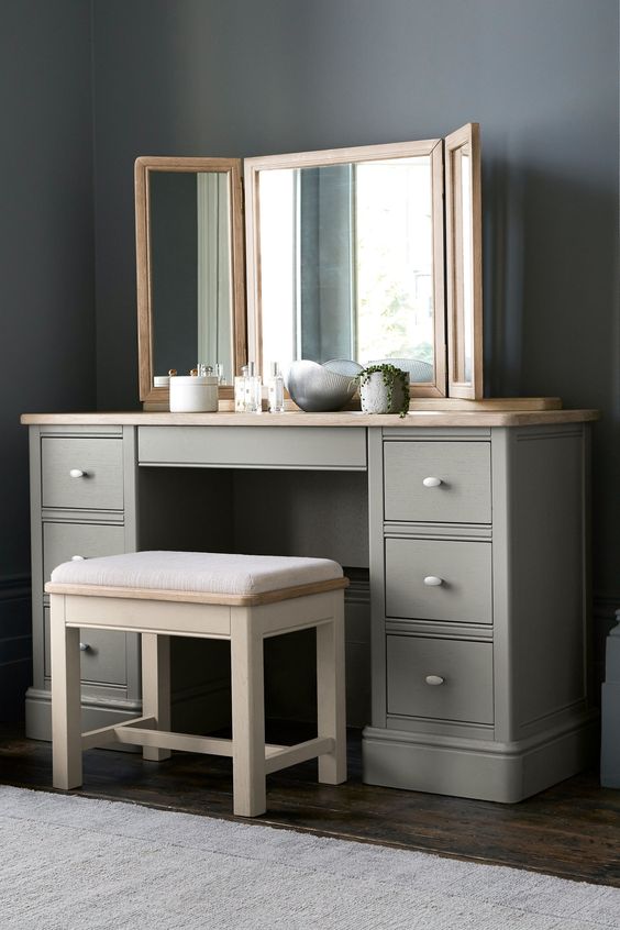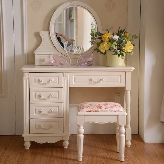 Dipping into the vintage reserves, this dressing table offers a timeless design with its classic mirror shape and ample drawer space. It’s a piece that would resonate with those who appreciate the beauty of bygone eras and seek a dressing table decor that’s both nostalgic and functional.