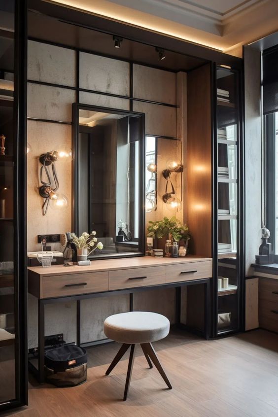 Here we encounter a dressing table that brings an industrial chic vibe to the bedroom. The sharp lines, combined with a bold, structured mirror, create a statement piece. This table not only serves as a functional space for getting ready but also doubles as a striking piece of room decor.