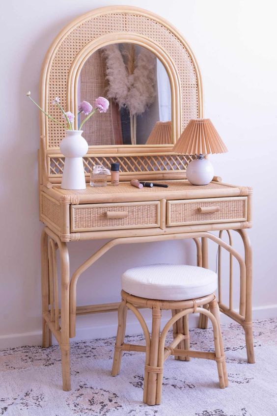 Bohemian charm exudes from this rattan dressing table, with its natural textures and gentle curves. The mirror reflects not just one’s image but also a sense of relaxed, carefree style that is both personal and inviting.