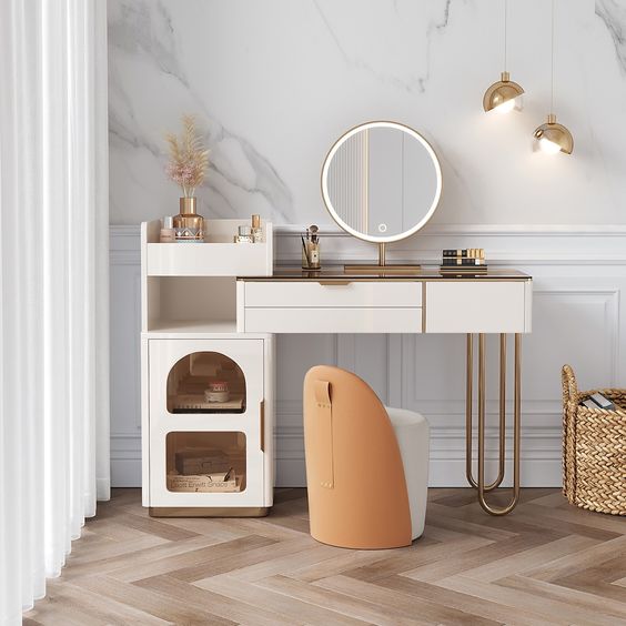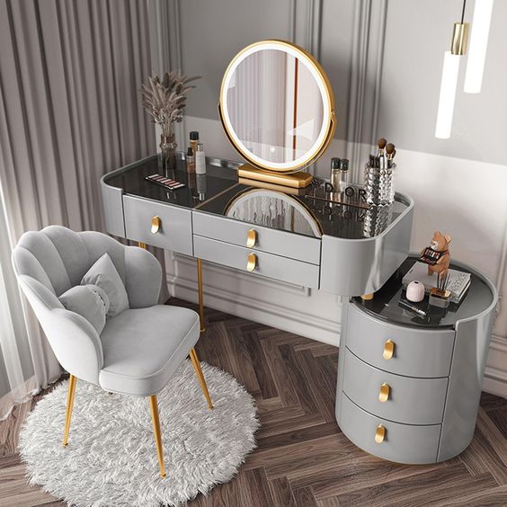 Picture a dressing table that is not just furniture but a statement of modern sophistication. This piece boasts a unique round mirror and tiered storage units that spin like celestial bodies around a central sun. The dressing table design is accentuated by gold accents, marrying luxury with functionality—a true nod to the dressing table ideas bedroom modern theme.