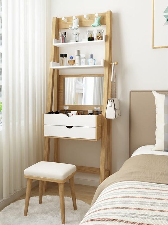 Maximizing space without compromising on style, this dressing table is a perfect fit for smaller bedrooms or apartments. Mounted on the wall, it offers a full-length mirror, handy shelves, and a discreet drawer, ensuring that every inch is used efficiently.