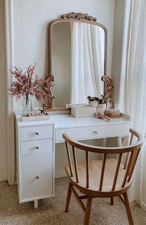 This dressing table exudes classic charm with its elegantly carved mirror and the understated beauty of its white finish. The clean lines of the table are complemented by a vintage-inspired chair, creating a nostalgic yet fresh corner for daily rituals. The simplicity of the design, paired with the functionality of multiple drawers, embodies the dressing table ideas 2024 that embrace timeless elegance.