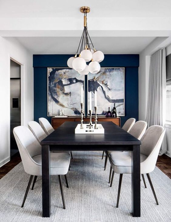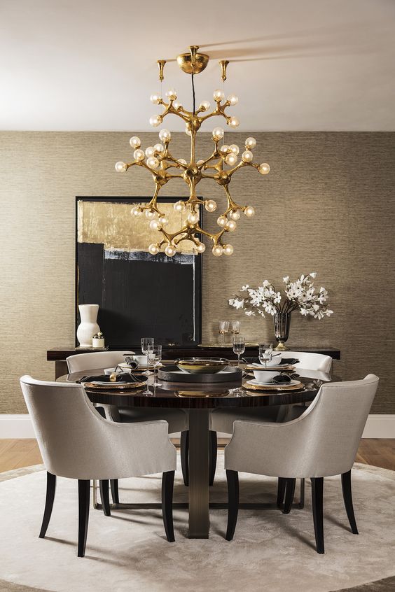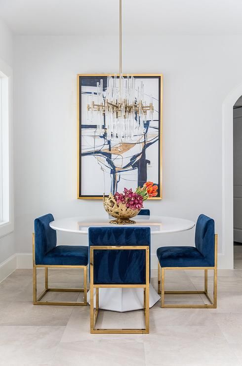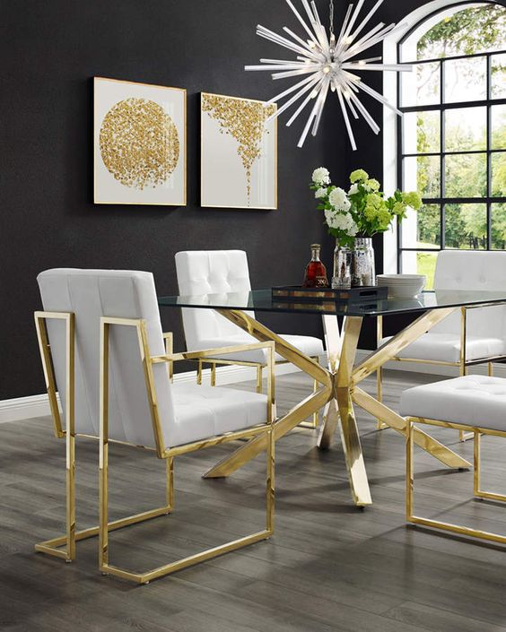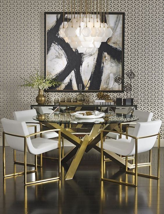 The luxury dining chair gold theme is quintessential for those who appreciate a touch of opulence in their furnishings. Featuring sleek white chairs with golden frames, this design exudes a modern yet timeless allure. The geometric lines of the chair legs add a contemporary edge, making them a perfect match for the glass table and the bold artwork that takes center stage. These chairs are a brilliant example of how luxury dining chairs modern design can create a focal point in a minimalist setting.