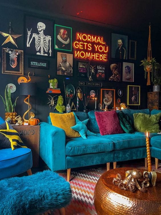 Dive into an eclectic living room with a vibrant gallery wall. This section will highlight how unique art pieces and neon signs can reflect a goblin core or boho style, creating a personalized and aesthetic space.
