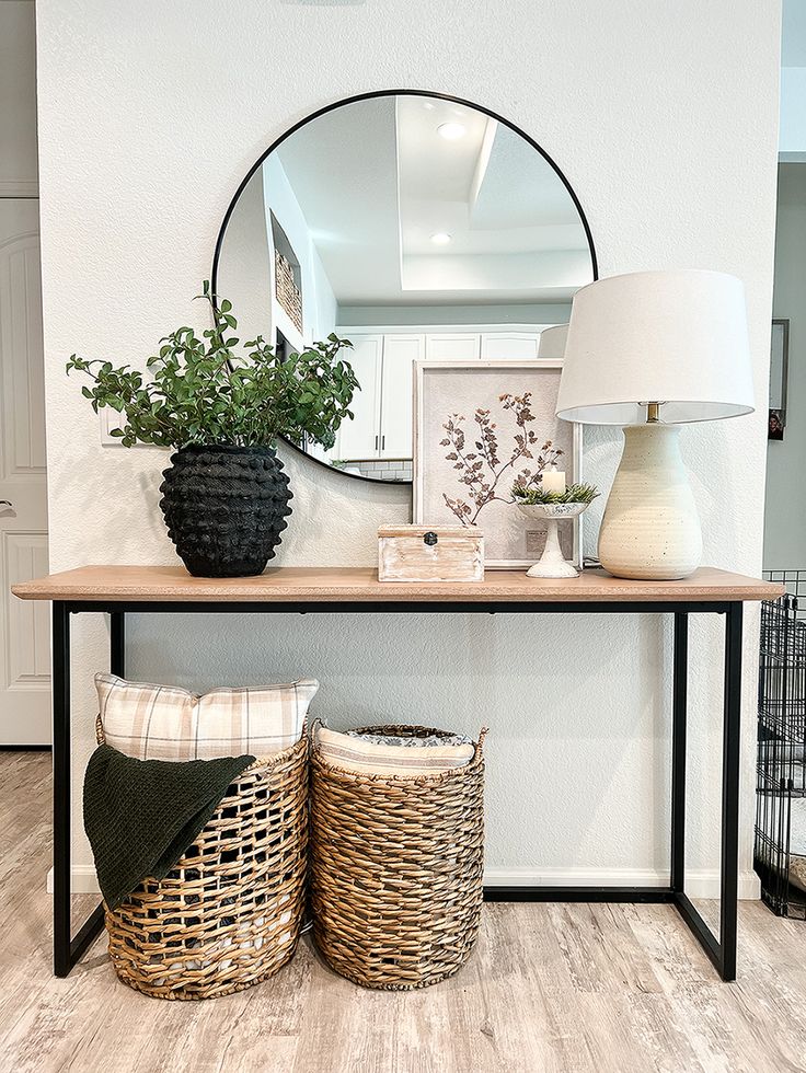 Finally, discover how to create a welcoming entryway with a simple yet stylish mirror and console table arrangement, featuring woven baskets for smart organizing and a clean look.