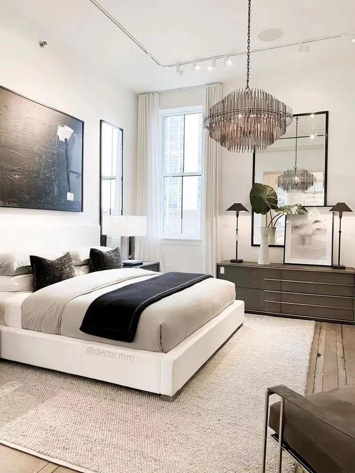 This bedroom inspires with its blend of modern furniture and a dramatic art piece, embodying both minimalist and modern room inspo. Tips on selecting statement artwork and neutral bedding for a clean, simple aesthetic will be shared.