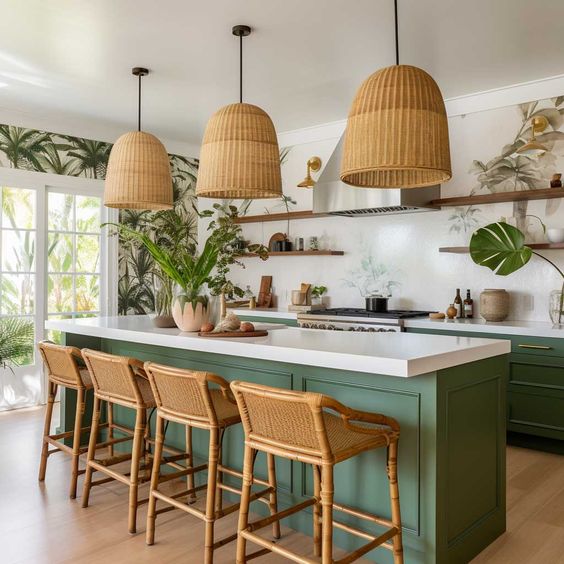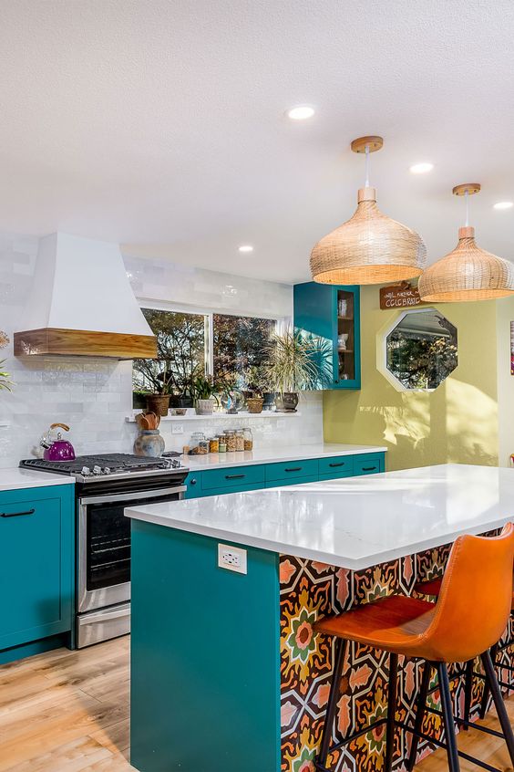 A burst of color brings this kitchen to life, embracing a boho spirit with its vibrant cabinet tones and eclectic patterned skirt under the island. Wicker pendant lights add an organic touch, while the open shelving keeps the space feeling airy and free. This kitchen is a bold statement, perfect for those looking to infuse their home with personality and cheer.