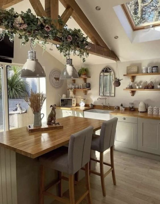 The charm of rustic kitchens continues to enchant, and this particular design takes it up a notch with a stunning skylight that bathes the space in natural light. Exposed wooden beams adorned with greenery, combined with modern pendant lighting, offer a harmonious balance between the old and new. This kitchen is a testament to the beauty of natural materials and the splendor of natural lighting.