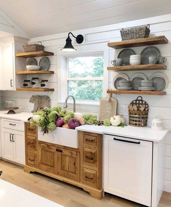 In this kitchen, the shabby chic trend is reimagined with a modern twist. The crisp white shiplap walls serve as a perfect backdrop for open wooden shelving, showcasing a collection of vintage pottery and woven baskets. The farmhouse sink is framed by rustic wooden cabinets, providing a charming contrast and adding to the room’s visual warmth. It’s an inviting space that celebrates simplicity and craft.