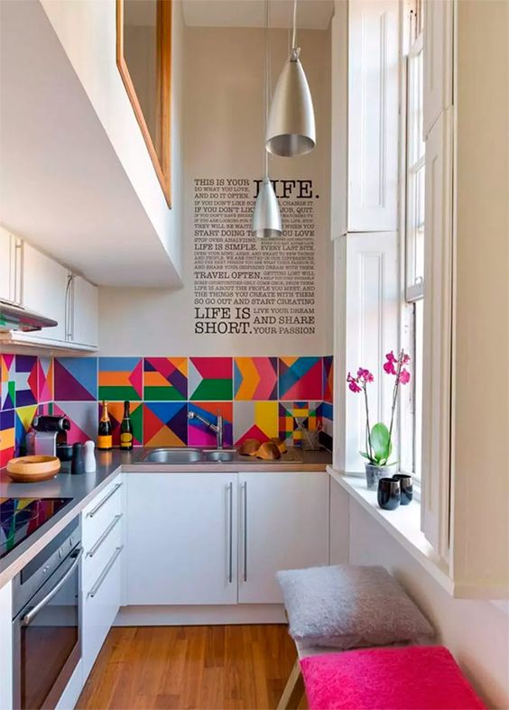 A small space transformed into a colorful oasis, this kitchen leverages a color block technique to delineate areas within the kitchen, making it feel larger. The striking wall art adds depth and inspiration to the room, while the window seat introduces an unexpected element of coziness. This kitchen proves that bold design choices can work wonders in a compact space.