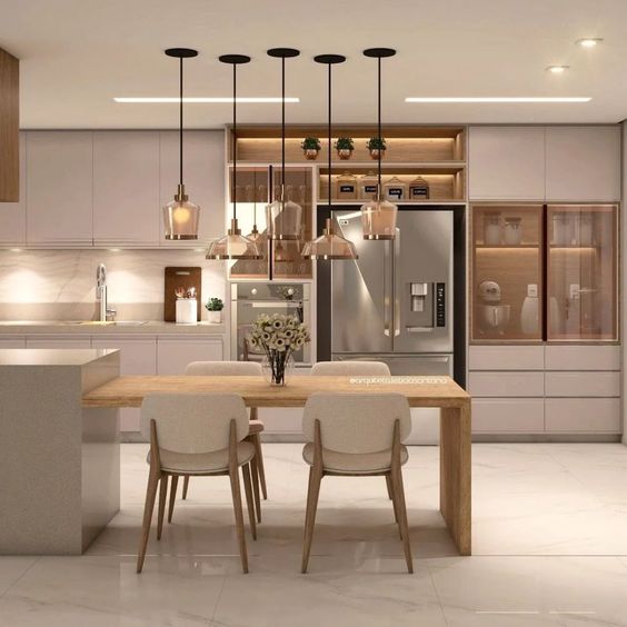 This kitchen breathes understated opulence with its muted color palette and sophisticated lighting arrangement. The streamlined cabinets with integrated appliances exude contemporary elegance, and the wooden table provides a warm gathering spot. The pendant lights are a modern take on the classic chandelier, adding a refined finishing touch to the space.