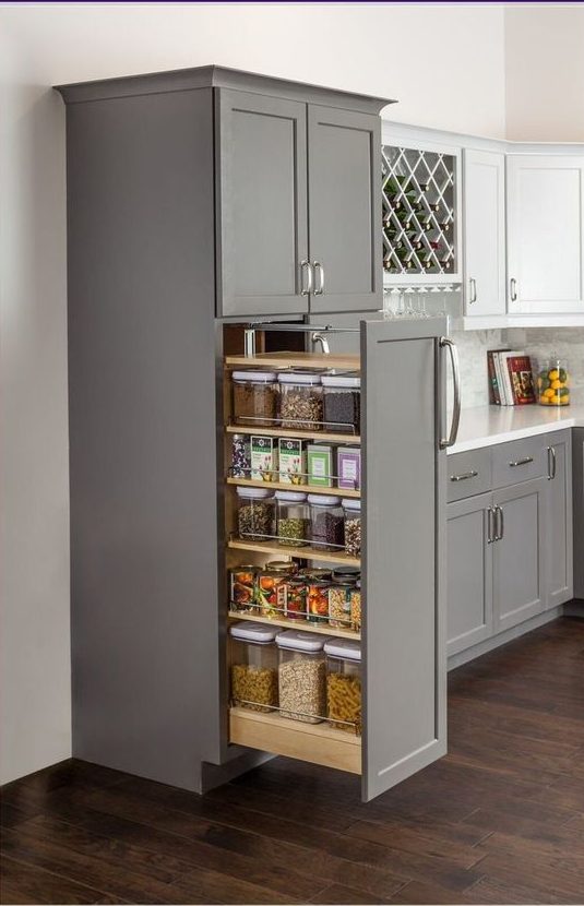 Innovation meets organization in this kitchen’s smart storage design. A tall, gray pantry cabinet reveals an array of pull-out shelves, making every spice, jar, and box easy to access. This is a perfect example of a kitchen remodel on a budget that doesn’t skimp on functionality. It’s the kind of project that turns a simple storage area into a highly efficient space, proving that great design is also about what you don’t see.